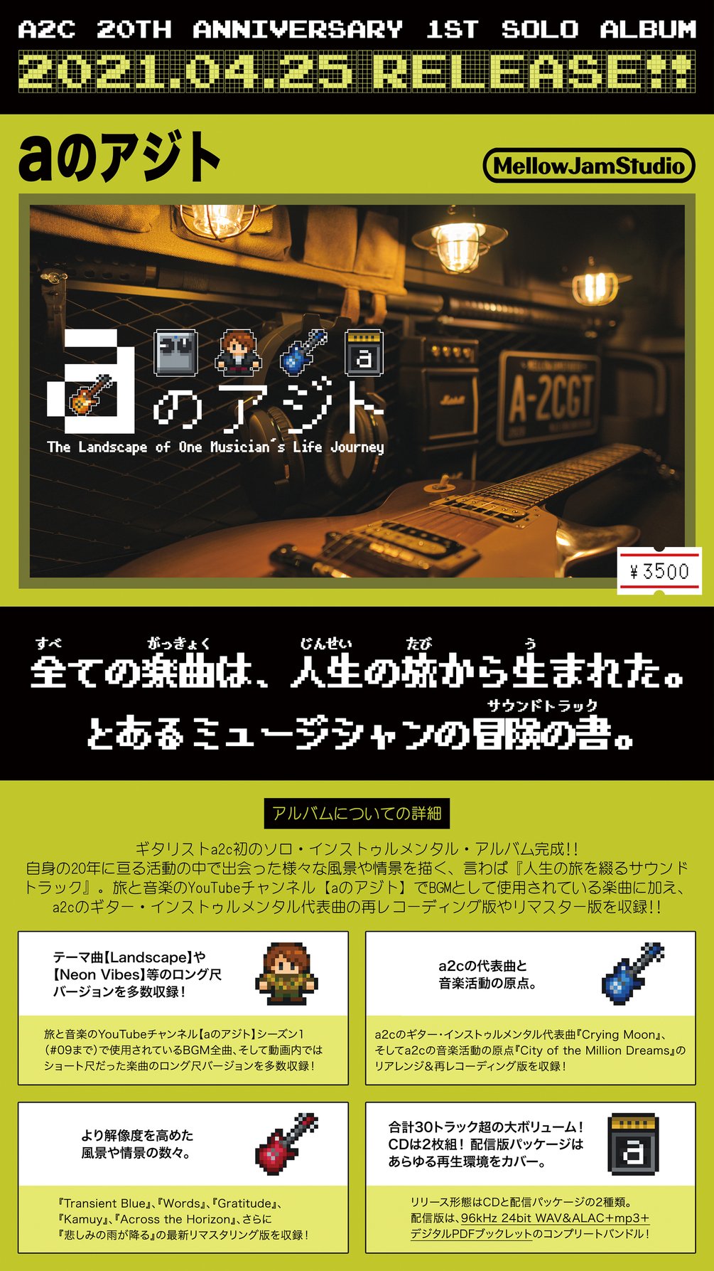 自身の20年に亘る活動の中で出会った様々な風景や情景を描く、言わば『人生の旅を綴るサウンドトラック』。旅と音楽のYouTubeチャンネル【aのアジト】でBGMとして使用されている楽曲に加え、 a2cのギター・インストゥルメンタル代表曲の再レコーディング版やリマスター版を収録! !